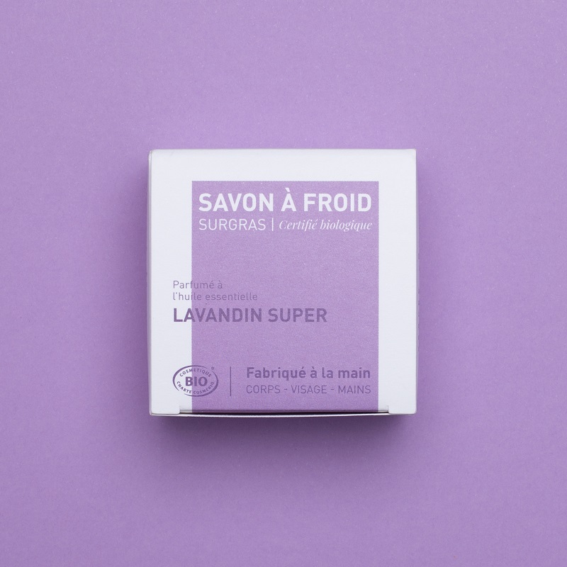 Lavandin super est un savon surgras, saponifié à froid, fabriqué avec des ingrédients naturels, sans couleur ajoutée et parfumé avec une seule huile essentielle. L’huile essentielle de Lavandin super possède des vertus décontractantes, apaisantes. Il convient parfaitement aux adultes, et aux grands enfants et est idéal pour se laver le corps, le visage et les mains. Ce savon été fabriqué en collaboration avec la marque parisienne Atelier Populaire fabrique des produits cosmétiques naturels au maximum biologiques. Ils sont faits à la main et certifiés biologiques par Ecocert selon le référentiel COSMOS, ainsi que labellisés Cosmébio et Slow Cosmétique. Les points forts : pour tous types de peau produit certifié BIO fabriqué en France sans huile de palme vegan Ingrédients: Sodium cocoate**, Aqua, Sodium sunflowerseedate**, Glycerin**, Lavandula hybrida oil*, Helianthus annuus (sunflower) seed oil*, Linalool***, Limonene***,Tocopherol *Ingrédients issus de l'Agriculture Biologique **Transformés à partir d'ingrédients biologiques ***Naturellement présents dans les huiles essentielles
